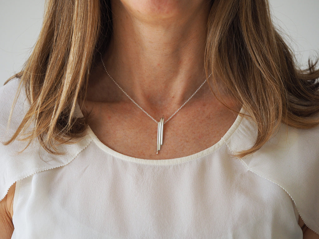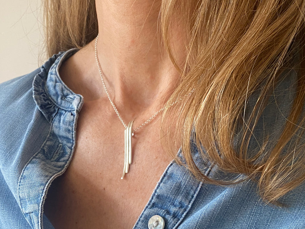This necklace embodies the push and pull between fluid and static. It echoes time spent combing the shoreline for treasure, and the power waves have to return things once lost in the deep.